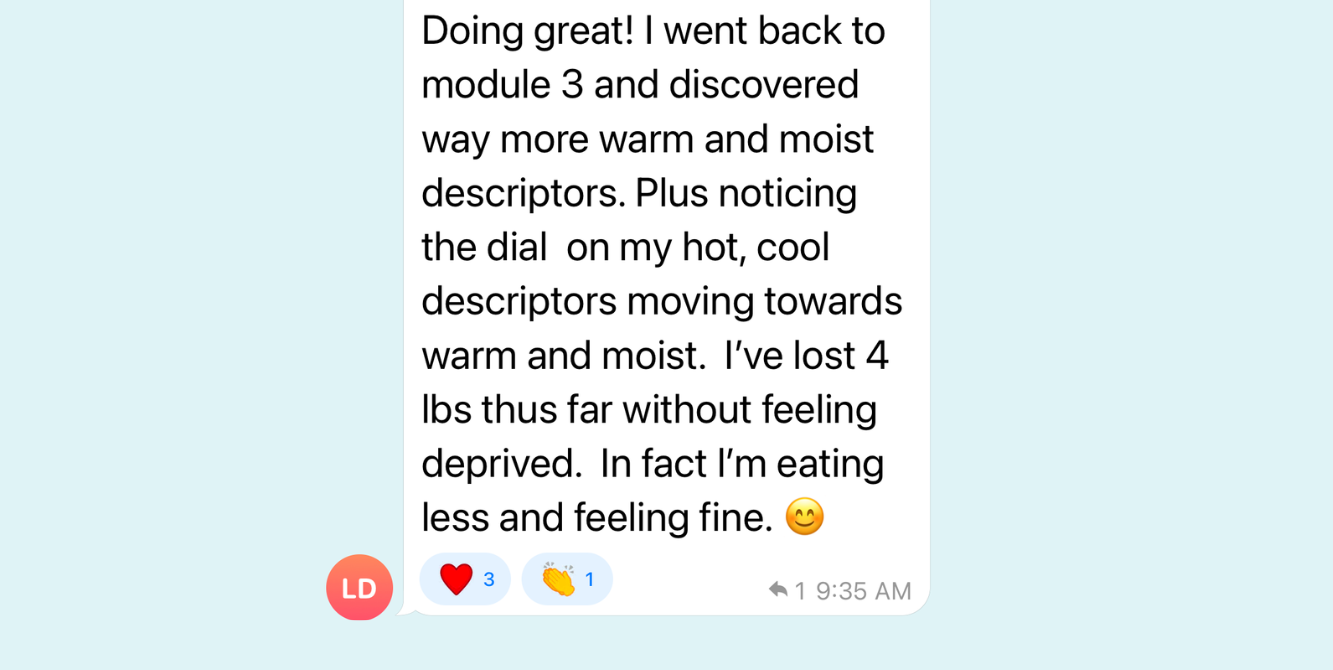 No. You will not be counting calories. You will not be following a rigid meal plan. You will not be cutting 10 food groups. You’ll learn how food interacts with your unique inner climate® - so you can make intelligent decisions without fear or obsession.