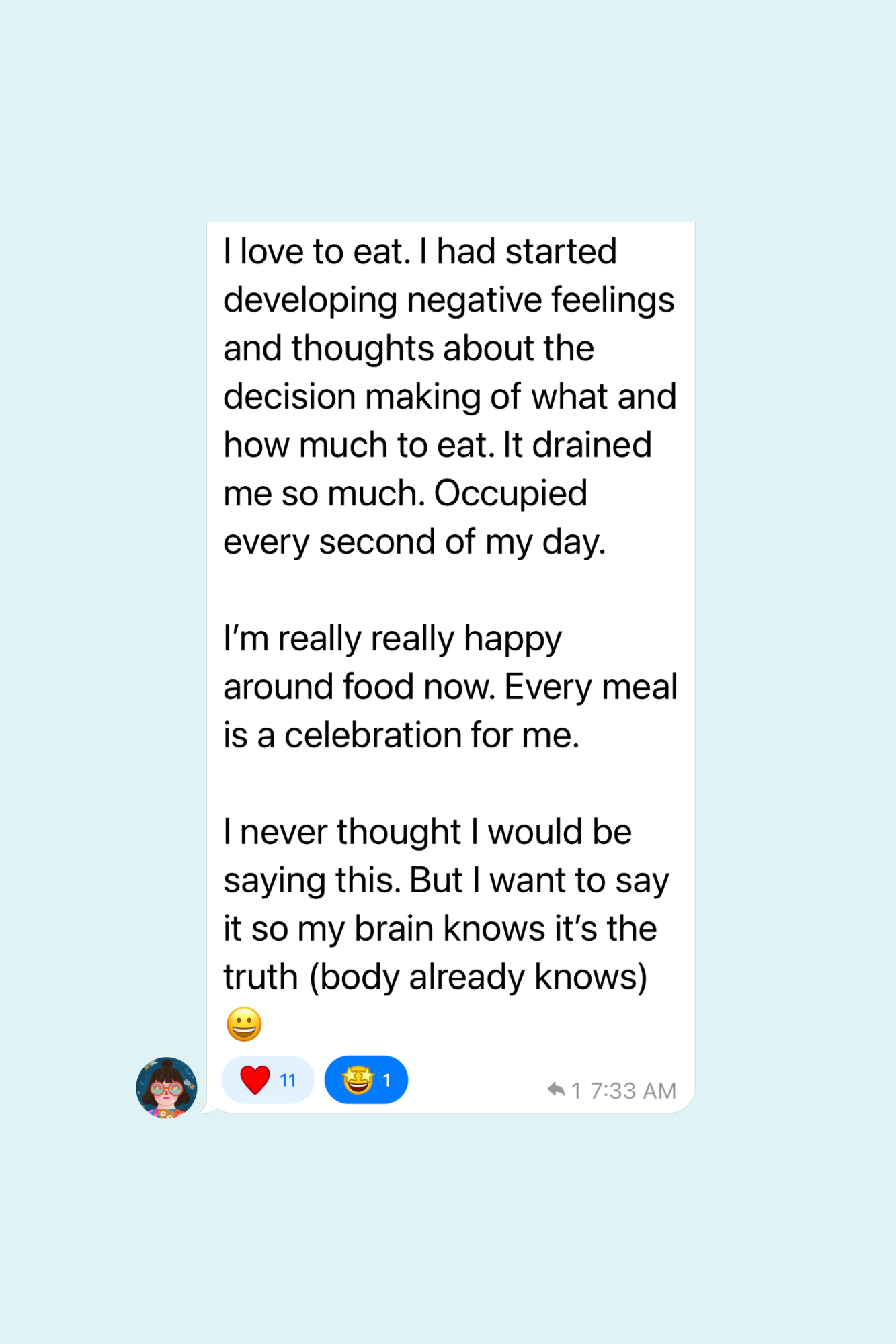 - You're constantly doubting your food choices - "What do I have to eat to feel good in my body?" You're always questioning, always second-guessing. Is this the right thing? Am I doing what's right? That confusion and disconnect follows you everywhere.